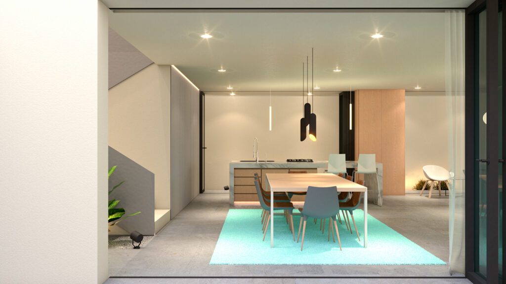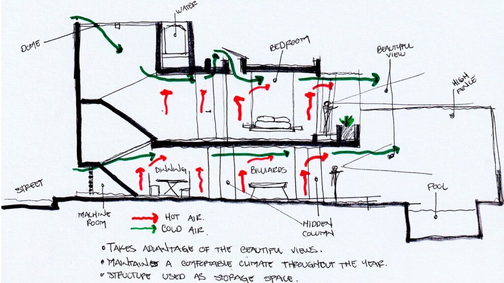 La orientación y diseño de la vivienda permiten una ventilación cruzada eficiente y un aprovechamiento óptimo de la luz natural, reduciendo la necesidad de sistemas artificiales de climatización. Esto no solo mejora el confort térmico, sino que también contribuye a la sostenibilidad del proyecto.